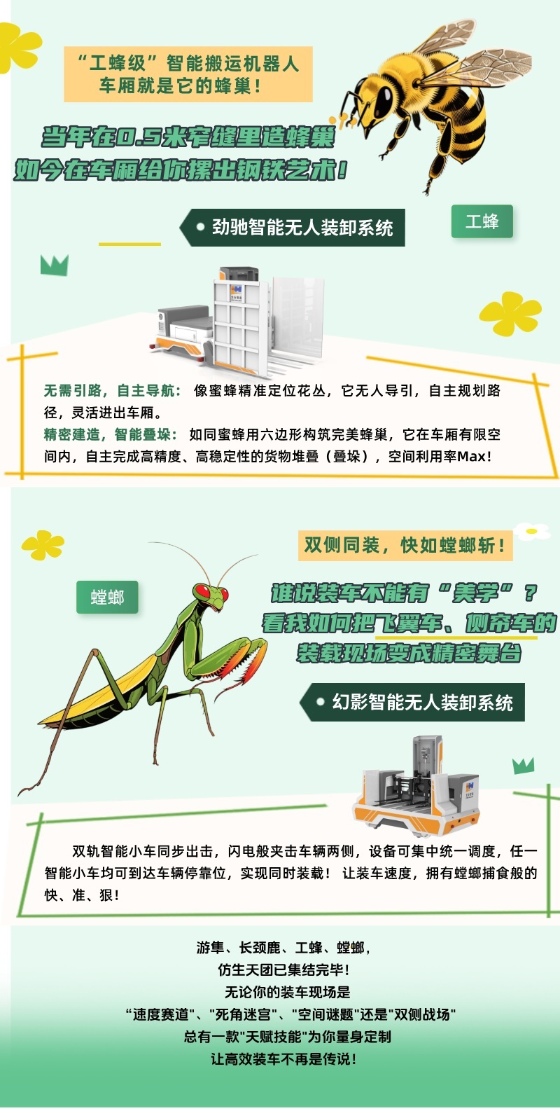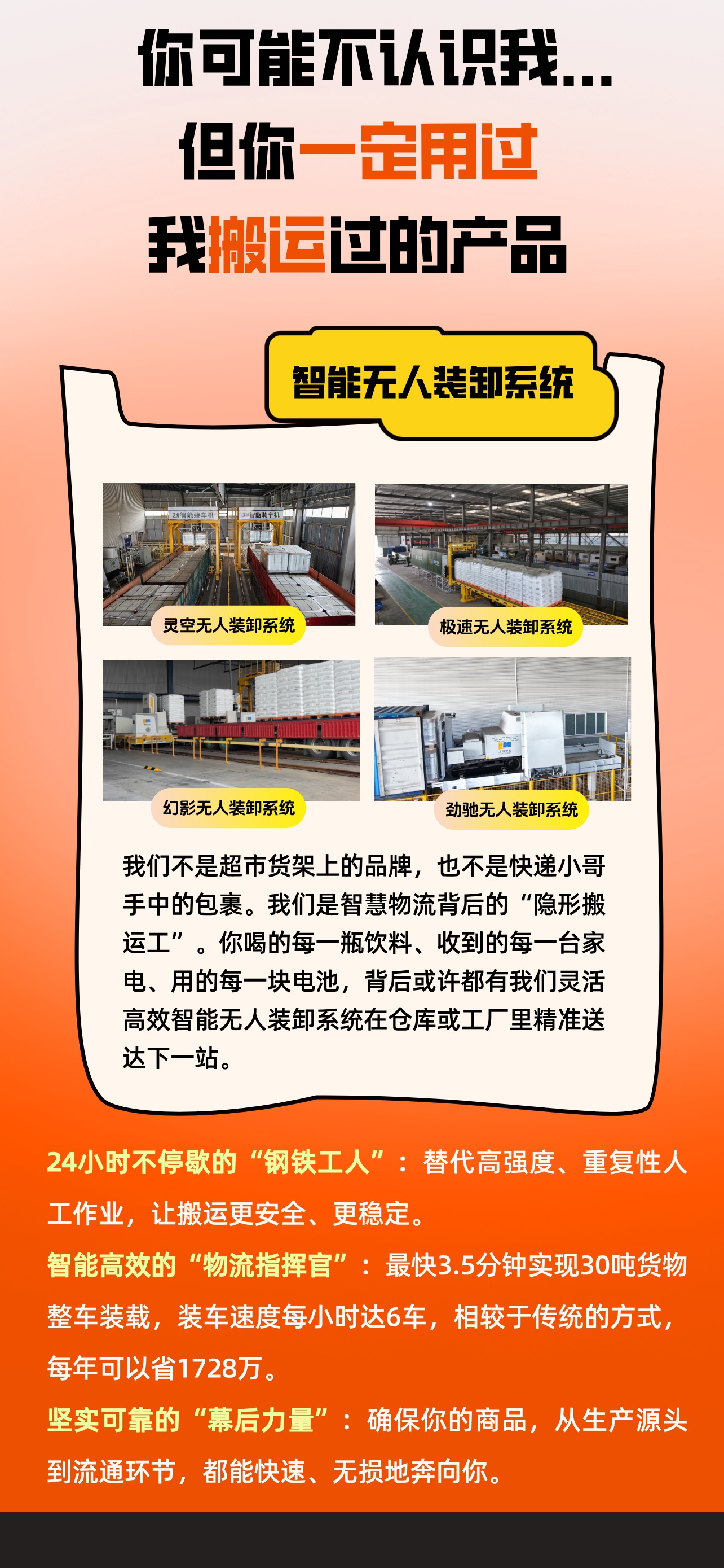 幻影/靈空/極速/勁馳四大產(chǎn)品線:全面覆蓋國內(nèi)公路運輸所有車型,包括后裝式集裝箱車、飛翼式集裝箱車、卷簾車、邊欄板可拆放及不可拆放平板車等終端物料發(fā)貨裝車,裝車過程實現(xiàn)自動化、智能化操作,20分鐘內(nèi)完成30噸貨物裝車,產(chǎn)品填補國內(nèi)終端物料智能無人裝車空白,可完全替代國外進口產(chǎn)品,獲評省內(nèi)首臺(套)重大技術裝備4項、省級重點新產(chǎn)品9項。